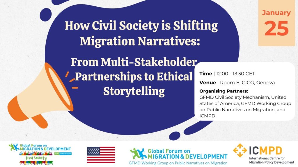 The GMFD Civil Society Mechanism, in collaboration with the United States of America, the GMFD Working Group on Public Narratives on Migration and the International Centre for Migration Policy Development (ICMPD) invites all GFMD Summit delegates to a side event on multi-dimensional and multi-stakeholder partnerships in balancing public perceptions about migration and migrants.